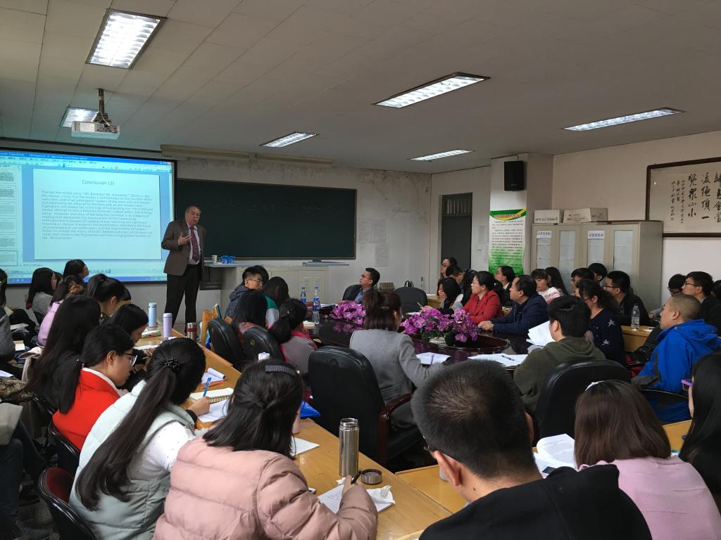 报告上,Massimo Verdicchio教授以爱伦·坡《人群中的人》、霍桑《牧师的黑面纱》、麦尔维尔《抄写员巴特比》三部短篇小说为例,列举了大量的小说文本之内的材料,同时辅以生活中的实例生动地阐述了美国文学中的隐喻。Verdicchio教授认为,文学作品的解读是与其文本本身的不可解读并存,因为作品中的每个人物都是有秘密的,这种秘密又是不希望被别人知道的,犹如人人都戴有一个隐形的黑面纱,作者虚构的故事文本在一定程度上解构了读者找寻这个秘密的一切努力。讲座中,比较文学与世界文学教研室主任高超副教授穿插着对Verdicchio教授用英语讲授的主要内容做了摘要式的解说,他认为Verdicchio教授提出的阅读方法属于美国公司派新批评的“文本细读法”(close reading),它是一种“封闭式阅读”,即把那些传统批评理论中的历史的、伦理的因素、传记材料、读者反应等与文本剥离,而只注重文本,重视文本内部的分析,因此读者解读文本应回归文本自身。
