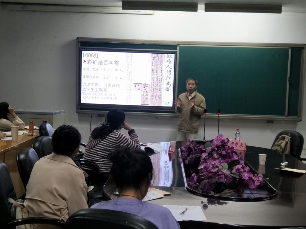 项教授立足于吴语的区别性特征,从《汉语方言地图集》选取6幅方言地图,在对所涉语言项目的种种变异形式进行两分的概括后分别绘制出同言线地图,并将它们综合在一起,从而呈现出可以用来界定吴语区的同言线束,最后还通过同言线和高程模拟的综合来观察各同言线对中心区的偏离程度。项老师用一个实例层层深入,为师生展现了方言地理学的研究思路、研究方法,使大家深受启发。报告期间项教授严谨的治学态度给大家留下了深刻的印象。