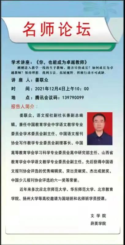 姜联众老师的讲座围绕卓越教师的成长和培养展开,以大量全国知名模范教师的成长历程为例,为同学们指明了成为名师的路径。他认为,想要成为一名卓越教师,必须做到:心头有梦,保持理想;足底有路,找准方向;目中有书,拓宽视野;笔下有文,积极行动!