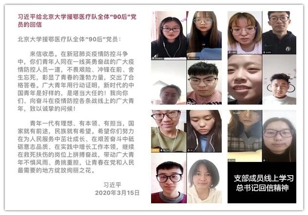会上,支部成员郭豪杰首先带领大家学习了习近平总书记给北京大学援鄂医疗队全体“90后”党员的回信。之后,支部成员杨帆结合本次疫情中涌现的许多“90后”逆行者的事迹,谈了自己的感想,他提到,习近平总书记的回信既是对青年的高度肯定,也是对青年的殷切希望,我们要谨遵总书记教诲,充分体现出青年担当,在国家需要我们时,主动请战;支部成员闫嘉欣提到,我们虽不能前往一线,但是作为青年的一员,理应在自己力所能及的岗位发光发热。支部其他党员也纷纷表示,要深入学习贯彻习近平总书记回信重要精神,不忘初心、牢记使命,坚决打赢这场疫情阻击战。会议最后,支部书记樊琳琳强调,虽然疫情相对之前已经有了明显好转,但是我们依然不能放松警惕,要继续做好个人防护,积极配合党和国家,打赢这场疫情防控的人民战争、总体战、阻击战。