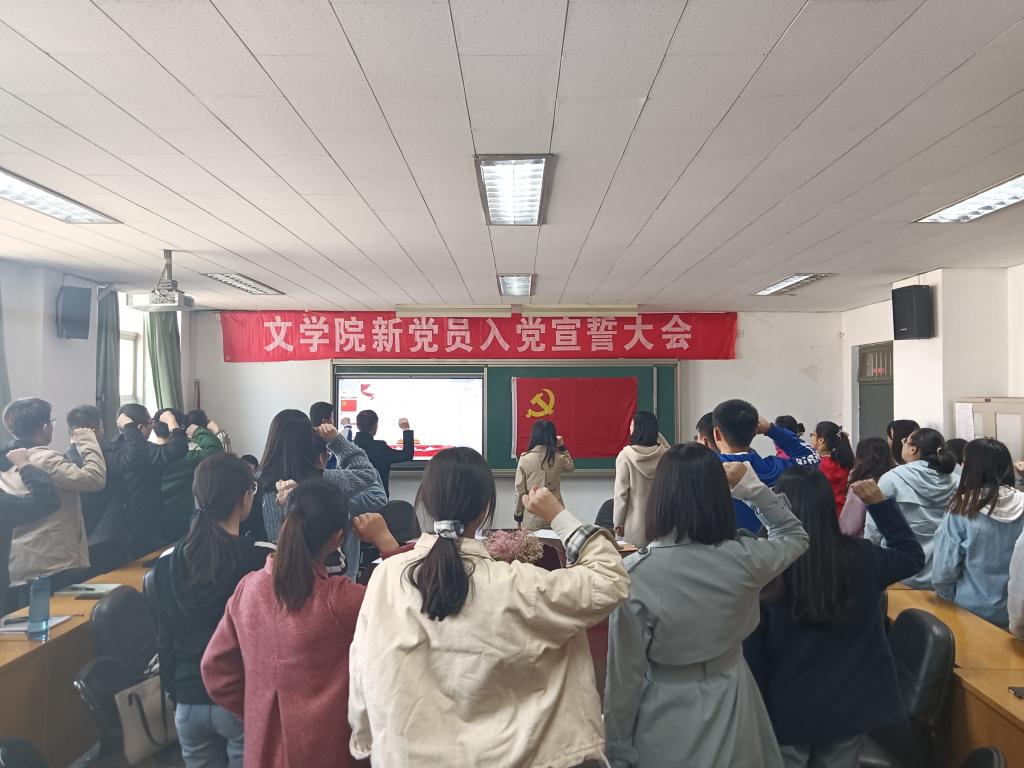 仪式伊始,全体人员起立齐唱《国际歌》,院团委副书记樊琳琳宣读了新党员名单。随后,由汉语言文学员工党支部李振同志领誓,全体党员面向党旗庄严宣誓。新党员代表梁笑、入党积极分子代表李珂昕依次发言,感恩党组织的教育培养,表达了永远跟党走的坚定信念。
