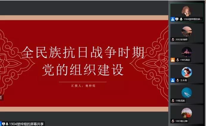 楚梓煜同志围绕全民族抗战初期党的组织建设的发展、抗战新阶段马克思主义组织路线的确立和干部队伍建设的加强、加强党的建设的“伟大的工程”、在整风运动中加强党的组织建设、党的第七次全国代表大会和抗日战争的胜利五大角度详细讲述了《中国共产党组织建设一百年》第四章“全民族抗日战争时期党的组织建设”的内容。她与支部同志一同回顾了党的六届六中全会、整风运动、党的第七次全国代表大会等重要历史事件,学习了《关于大量发展党员的决议》、《关于巩固党的决定》等相关文件。全体同志进一步理解了中国人民抗日战争胜利的深远意义。
