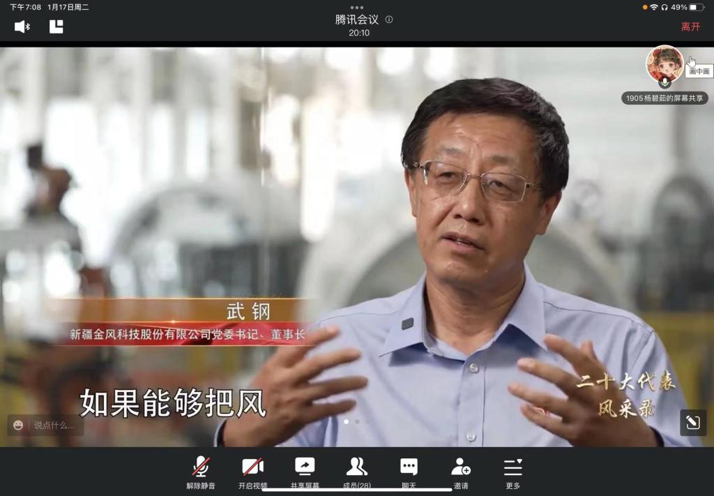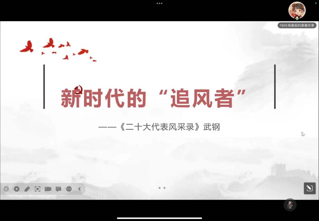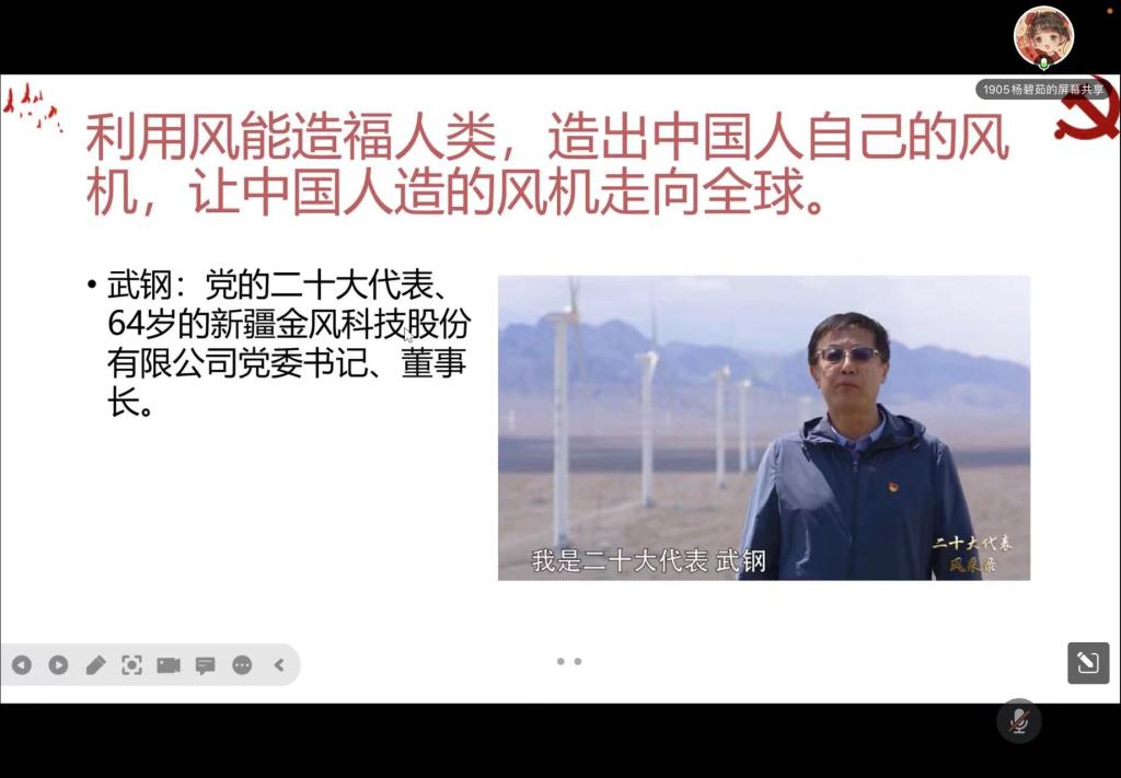 会上,杨碧茹同志介绍了《二十大代表风采录》,鼓励同学们以图书、电视系列片等多种形式学习党的二十大代表的先进事迹、高尚品质和精神风貌,感受他们敢于担当、开拓创新的优秀品质。她向同学们重点介绍了武钢同志初心不改、砥砺奋进,推动我国风电事业取得巨大进展的奋斗故事,号召大家汲取榜样力量,在新时代的道路上奋力奔跑。随后,全体党员共同观看中共中央组织部制作的电视系列片的相关视频,让同学们可感地、真实地了解到武钢同志的生活以及他三十年来的奋力拼搏。