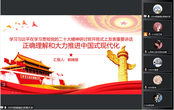 2月13日,304永利集团登录入口“学雷锋,送温暖”小组员工党支部线上开展“正确理解和大力推进中国式现代化”主题党日活动。会议由支部书记安李蓉主持,支部全体党员参加。员工党员杨婧俪同志担任主讲人。