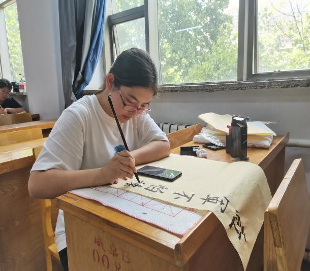 工作人员为部分同学发放了双面宣纸团扇,同学们创作出“知足常乐”“厚德载物”“和光同尘”等作品,表达了美好的希望和祝愿