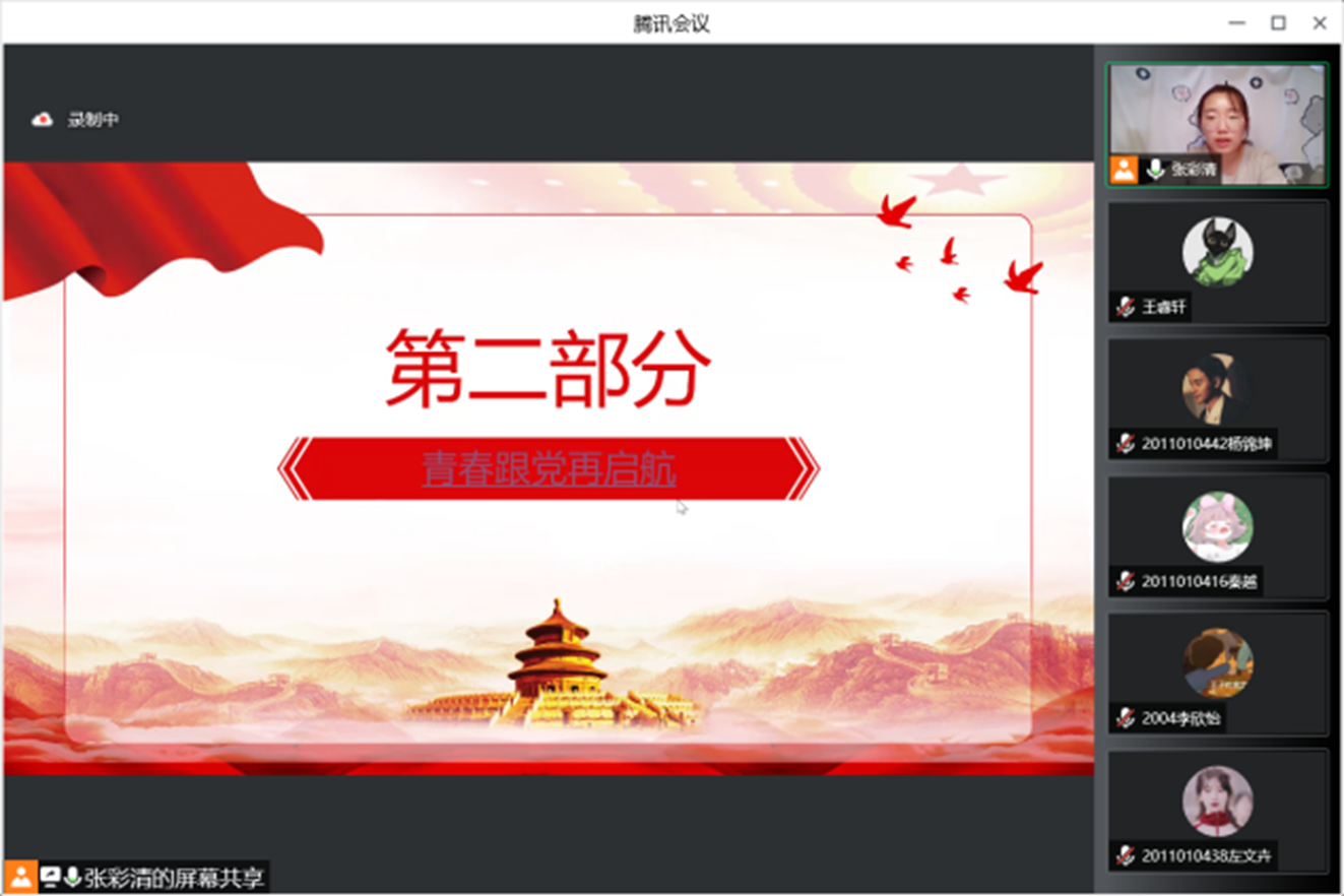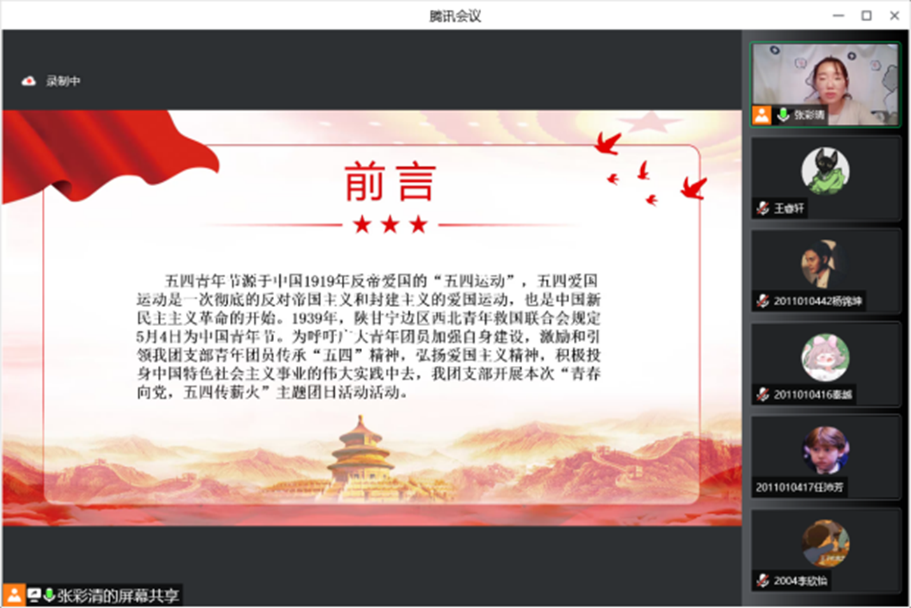 5月4日下午,2004团支部以线上腾讯会议的形式开展了“青春心向党,五四传薪火”主题团日活动,团支书张彩清担任主讲人,团支部全体成员参与学习。