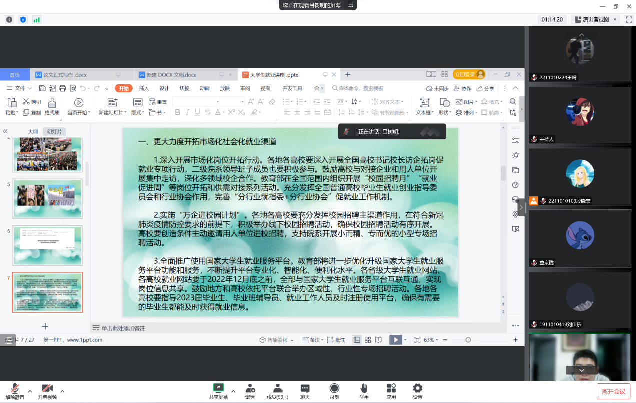 会议伊始,吕树明老师带领大家详细解读了教育部发布的《关于做好2023届全国普通高校毕业生就业创业工作的通知》,他强调当前疫情形势严峻,就业情况不容乐观,同学们一定要确立正确就业观念,不断提高自身综合实力。他以2020届和2021届毕业生毕业去向为切入点向同学们讲解了304永利集团登录入口就业形势,让同学们更加清晰地了解就业形势,并就如何树立正确的择业观提出相关建议。最后,吕老师指出同学们要对就业大环境有清晰的认知和理解,正确认识自我、确立职业理想、科学规划职业,保持积极乐观的就业心态,转变陈旧的择业观念,结合社会的需要理性就业、勇敢创业。