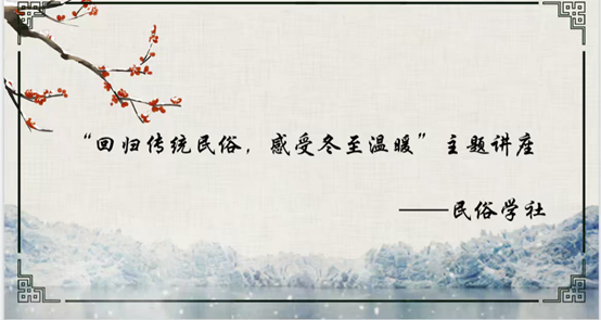 活动伊始,主持人介绍了冬至的重要性以及主讲老师。随后,讲座正式开始。吕老师围绕多方面、图文并茂地讲述了冬至节俗源流及文化内涵。吕老师通过讲述《小至》、《邯郸冬至夜思》两首古诗,引出了冬至对于中国古代人民的意义所在,又从自然历法、社会人文对冬至的节气属性进行了详细的介绍。老师讲解的中国冬至节俗也让同学们听的津津有味。老师也从山西省内的冬至节俗出发,谈到了太原市的冬至习俗,将冬至知识与亲身体验相结合。最后,同学们各抒己见,就“冬至家乡民俗”分享自己的感受,活动气氛十分活跃。