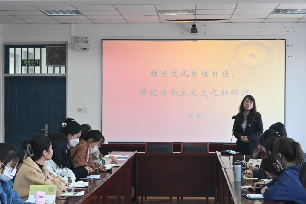 段俊以“推进文化自信自强”为主题,紧扣党的二十大内容与精神,解读了党的二十大对文化、文艺等方面的指示与要求。“文运同国运相牵,文脉同国脉相连”,她强调,要在教育过程中挖掘优秀传统文化基因,将文艺与大众结合,坚定文化自信;院员工会举办相关活动也要坚持以传承优秀传统文化为理念,创造性转化、创新性发展,举办更多富有文化色彩进行文笔创作的特色活动,培育同学们的社会主义核心价值观,努力为铸就社会主义文化新辉煌添砖加瓦。