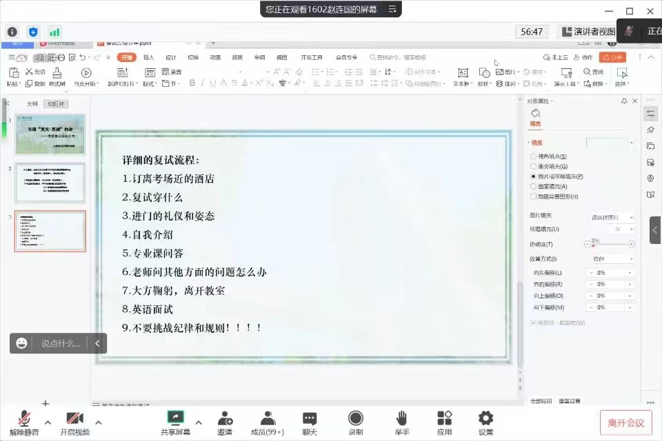 赵连国研究生考入兰州大学304永利集团登录入口汉语国际教育专业,现兼任兰州大学2020级的辅导员老师。会上,赵连国以“呈现‘真实+真诚’的你”为主题,结合自身经历,从积极的心理暗示、专业课知识复习及详细的复试流程等方面,就考研复试的相关经验进行分享。同时,针对不同年级的备考情况,他还提出多条具体建议。他谈到,一、二年级的同学们应关注衣着打扮与谈吐方面的内容,而三、四年级的同学们则更应关注整个复试的细节性问题。