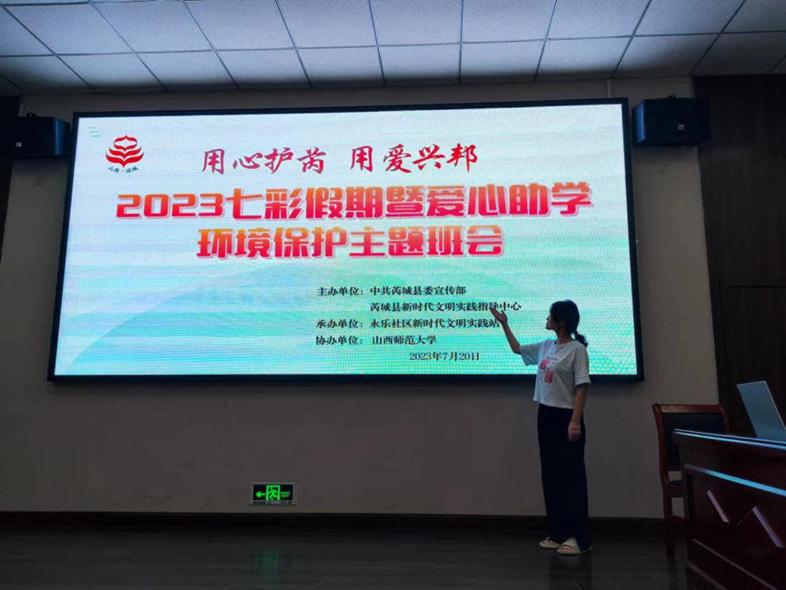 2023年8月10日,304永利集团登录入口“学雷锋,送温暖”小组爱心助学团队山西芮城线下分队参与协办了由中共芮城县委宣传部、芮城县新时代文明实践指导中心主办、永乐社区新时代文明实践站承办的“2023七彩假期暨爱心助学环境保护主题班会”,芮城县永乐社区“用心护芮,用爱兴邦”七彩假期爱心助学志愿服务队的队员们担任主讲人。