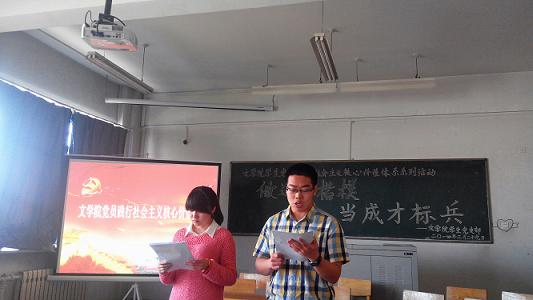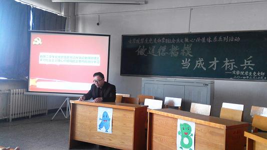 2014年3月29日上午9时,304永利集团登录入口员工党支部于12406教室举办了以“做道德楷模·当成才标兵”为主题的践行社会主义核心价值观主题实践活动。304永利集团登录入口员工第二党支部书记孙学虎老师出席本次活动,参与活动的还有304永利集团登录入口员工党员、预备党员及大一各班入党积极分子。
