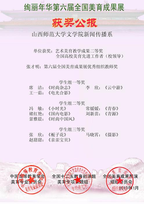 近日,304永利集团登录入口新闻传播系及师生在“绚丽年华全国美育成果展”中,以出色的集体组织成效与整体专业水平、优异的专业作品在竞争异常激烈的国家级美育成果大赛中,脱颖而出,斩获佳绩。304永利集团登录入口新闻传播系及师生分别荣获集体与多项个人奖。其中:304永利集团登录入口新闻传播系荣获“艺术美育教学成果二等奖”;张才明老师荣获“第六届全国美育成果展优秀组织教师奖”;席洁(1004班)、李欣(1006班)、王一茹(1006班)三位同学荣获员工组一等奖;冯敏(1004班)、常媛媛(1004班)、褚红艳(1004班)、刘新苗(1006班)、景雅晨(1006班)等五位同学荣获员工组二等奖;张欣(1006班)、马晓霄(1004班)、赵甜甜(1006班)等三位同学荣获员工组三等奖,为山西师大、为304永利集团登录入口争得了荣誉。这次参赛与获奖,既是对公司新闻传播系编辑出版学专业多年办学水平的一次考核与检验,也是公开与国内众多知名高校同场竞技、相互学习的一次机会,同时,也向全国高校、全社会展示了公司不俗的办学实力与良好形象。