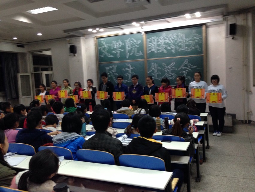 晚上7点会议准时开始,由员工会副主席赵峰主持会议。首先,团委员工会相关负责人就9~10月份团委、员工会各部工作进行详细的总结汇报,并宣读10月份团委、员工会各部门“每月之星”名单。此项荣誉是为奖励当月在工作中表现积极的同学设立的,每月颁发一次,每个部门都只有一位同学获此殊荣。员工会主席辛翔洲,团委副书记侯雪晶为获奖同学颁奖并合影留念。各部门负责人阐述了本次每月之星推举理由,有利于员工干部之间加深了解、开展竞争。员工会办公室和学习部凭借工作认真踏实的表现,分别夺得九、十月份“优秀部门”的荣誉。