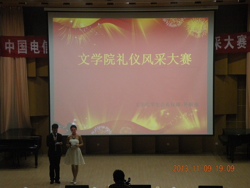 晚7点,师大音乐厅灯火辉煌,主持人宣布礼仪风采大赛正式开始。比赛共分为自我介绍、知书答礼、服装T台秀、个人才艺展示4个环节。礼仪部全体成员进行开场舞表演后,八位参赛选手以幻灯片为辅助分别作了自我介绍,并进入“知书答礼”环节,依次进行自主选题做答,此环节旨在考察她们对于基本文明礼仪知识的掌握程度。在个人才艺展示环节,八位选手分别进行了她们的才艺表演。她们的节目,形式多样,表演精彩,获得观众的阵阵欢呼与喝彩。“服装T台秀”是此次大赛的一大亮点,选手们身着各种风格的礼服,伴随音乐在台上尽情展现自己的风采,她们的精彩表现再次引发了热烈的掌声。大赛还特别设置了现场抽取幸运观众环节,每个抽奖环节都有三位幸运观众获得师大电信提供的礼品,有效的增强了与观众的互动,活跃了现场气氛。此外,比赛过程中还穿插了外联部的精彩小品《新闻联播之外联特写》,以及电信营业厅选送的员工个人演唱《两地曲》、迈克尔杰克逊的激情舞蹈等节目。