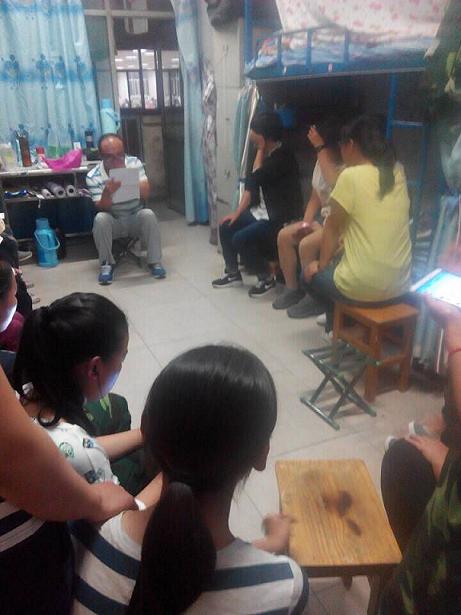 1503、1504班辅导员鲁立智老师向同学们讲述自己年轻时的军训经历,关切询问各宿舍新生的身体状况,提醒他们要按时作息。鲁老师还告诉大家应当正确处理学习与员工会和社团工作的关系,可积极参与但应当做好协调。