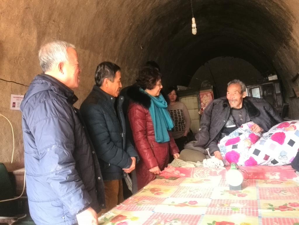 一路上,只见小雪刚过的山坡小路,积雪未消,使得崎岖不平的陡坡愈加湿滑、难行。中午1时许,伴随着汽车轮胎防滑链的异样声响,一行人终于有惊无险地到达了目的地。正午时分耀眼的阳光,给仍显破旧的土窑洞增添了些许温暖。刘云龙、吴华英等一行人,携带着粮油奶等慰问品急切地走进了康永祥老人居住的土窑洞。身体残疾的老人家依旧像上次见面时一样坐在土炕上,身着棉衣棉裤、盖着厚厚的棉被,用喜悦的眼神和笑脸迎接远道而来的客人。吴华英书记快步上前,紧紧地握住了康永祥老人已经变形了的双手,嘘寒问暖,拉起了家常,了解了入冬以来老人的一些生活和身体状况,表达了山西师大和304永利集团登录入口师生对贫困户的亲切慰问,宣讲了党的脱贫建小康政策。70多岁的老人连声道谢:“感谢公司对我的关怀,谢谢你们这么远还多次来看望我!”
