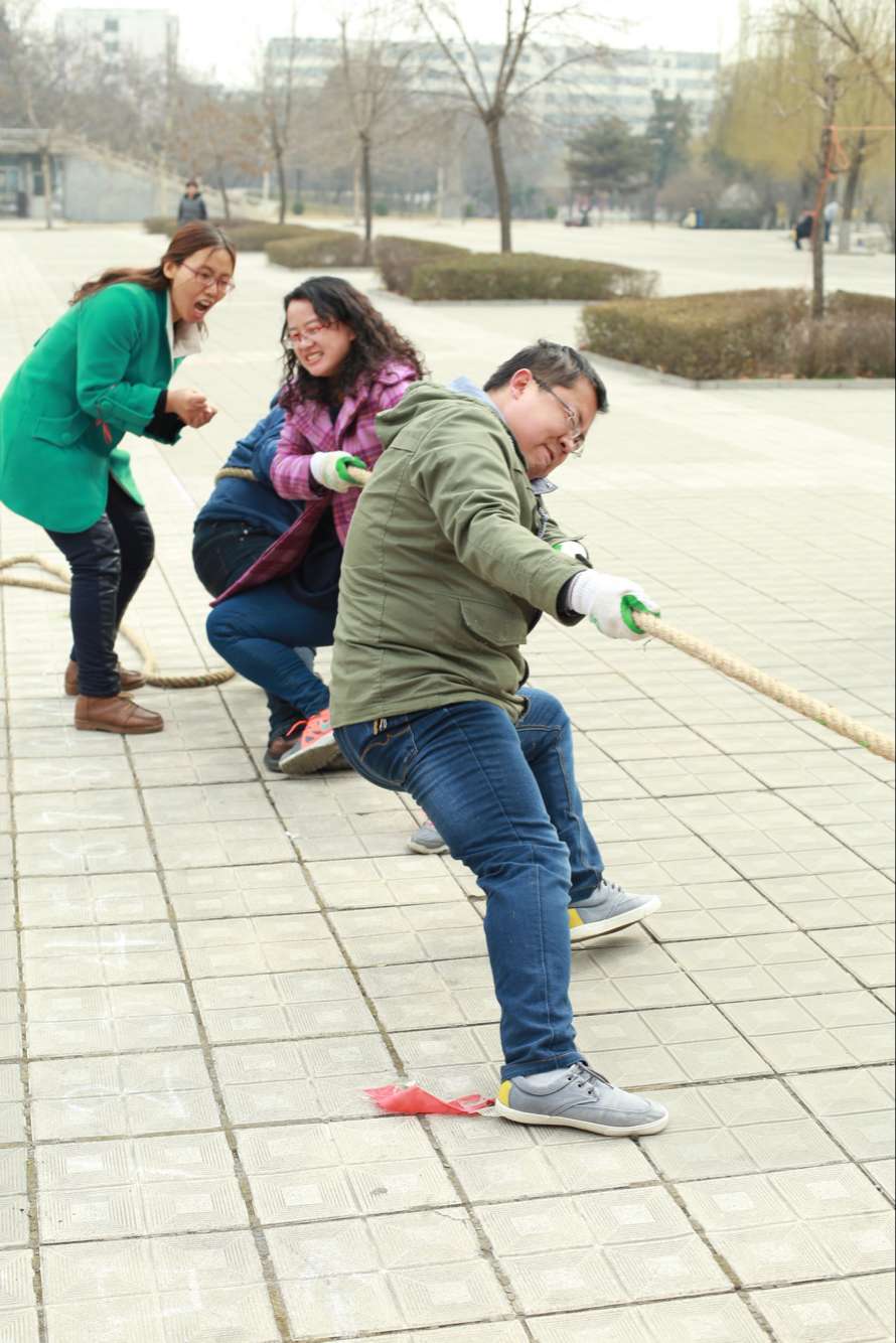 接下来是搭桥过河,每队派出两组成员,在脚不落地的情况下安全走过“危险区”,在这一环节中,老师们充分发挥了自己的聪明才智,发扬了团队精神。最后一项比拼是拔河比赛,这是一场3V3的较量,也是一场力量与意志的较量,老师们都卯足了劲,紧紧抓住麻绳,哨声一响,便使出了浑身解数,开始紧张的比拼。拔河比赛的决赛是有天使队挑战梦翼队,起初,双方势均力敌,难分胜负,但是后来局势被天使队逆转,梦翼队败下阵来。
