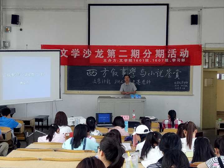 5月14日下午,由公司员工会学习部主办,1601、1607班承办的文学沙龙第二期分期活动——西方叙事学与小说鉴赏,在05203教室成功举办。此次活动的主讲是曹文亮老师,1601、1607班全体同学参加了本次活动。