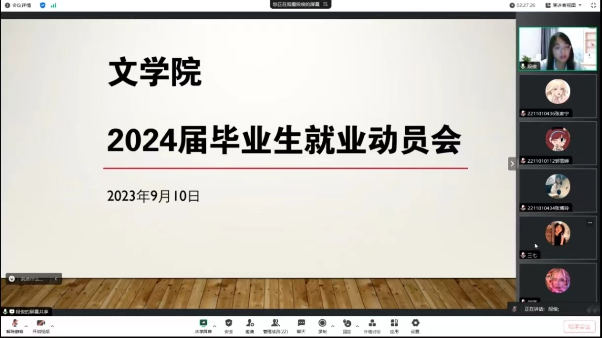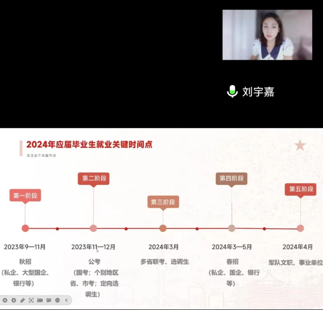 9月10日晚上,304永利集团登录入口于线上举办2024届毕业生就业动员会。动员会由副经理段俊主持,动员会还邀请2020届本科毕业生刘宇嘉进行学习经验分享分享,全体2024届毕业生参与。