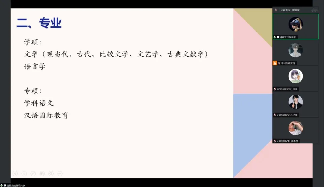姚锦宜从备考科目着手,将其分成专业课、政治、英语三大板块,并围绕各个板块展开详细讲述。她指出:专业课的备考学习需兼备基础知识、真题、热点三大核心要素,政治的备考学习关键在于背诵和刷题,而英语备考学习则需注重对各类题型的针对性练习。同时,她根据自身备考经验,给同学们推荐了优质的学习软件和网络课程,将极大的助力大家的“研”途路。