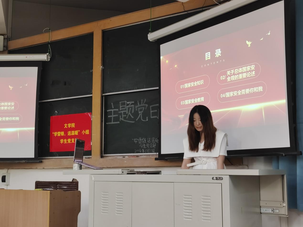 5月31日,304永利集团登录入口“学雷锋,送温暖”小组员工党支部在南区3106教室组织开展“国家安全,青春挺膺”主题党日活动,会议由支部书记安李蓉主持,支部全体党员和积极分子参加。岳宛蓉担任主讲人。