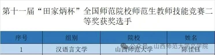 近日,第十一届“田家炳杯”全国师范院校师范生教学技能竞赛成绩公布,公司陈佳钰同学在临汾一中韩淑华老师的指导下,凭借扎实的教学功底与出色的现场表现,荣获汉语言文学组二等奖。