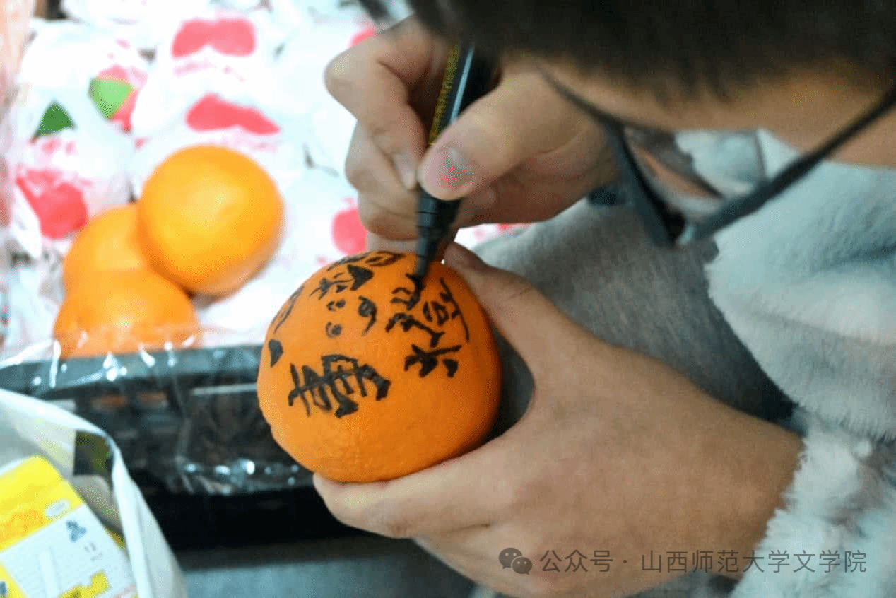 活动筹备阶段,志愿者根据考研学子备考实际需求,准备了橙子、巧克力、考试用具等物资,并在橙子上绘制图案、书写祝福语。相关物资完成打包后,志愿者于当晚前往宿舍楼,将物资礼包逐一送至考研学子手中,并与员工进行面对面交流,让备考学子切实感受到校园的暖心支持。